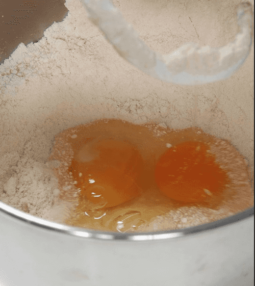 Добавить к тесту дрожжевую смесь, 2 яйца и 1 желток. Перемешивать на низкой скорости пару минут.