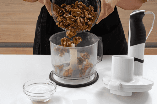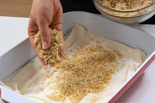 Распределить измельченные грецкие орехи по поверхности фило одним ровным слоем.