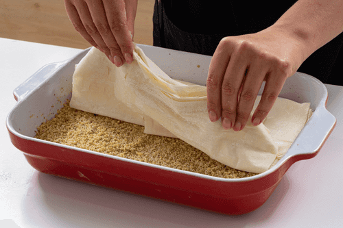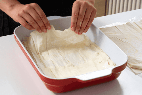 Положить стопку из 20 листов фило на противень. Если листы не помещаются, обрезать. Добавить еще 5–10 листов фило из другой пачки поверх первой стопки.