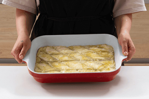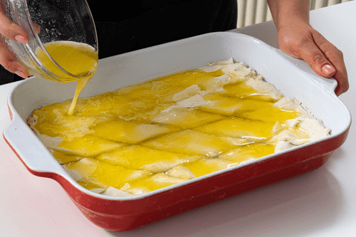 Равномерно полить пахлаву оставшимся растопленным маслом. Дать маслу осесть, на это уйдет около 5 минут.