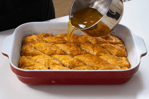 Достать пахлаву из духовки и сразу же полить сахарным сиропом.