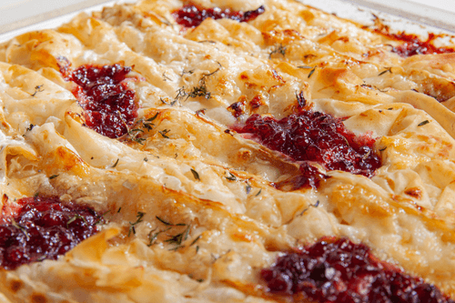 Пирог из теста фило с сыром бри — изысканное блюдо европейской кухни, сочетающее воздушную хрустящую текстуру теста фило с нежностью сыра бри. Этот пирог поражает своей контрастностью: сливочный сыр плавится между тонкими слоями хрустящего теста, создавая богатый, насыщенный вкус. Брусничный джем придает легкую кислинку, подчеркивая сливочность начинки. Традиционно подобные пироги встречаются в французской гастрономии, но их вариации распространены по всей Европе. Тонкие слои теста требуют аккуратности, но в результате получается эстетичное и утонченное угощение. Подавать его лучше чуть теплым, чтобы сыр оставался мягким и тянущимся. Это идеальный выбор для праздничного стола или уютного семейного ужина, особенно в сочетании с легким белым вином.