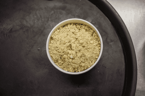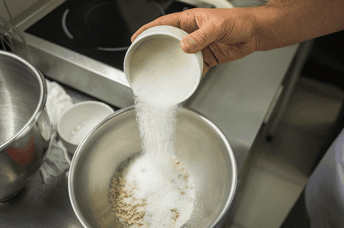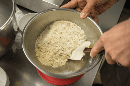 Смешать 45 грамм муки, 190 грамм сахара, 145 грамм орехов и 1 грамм ванильной пудры.