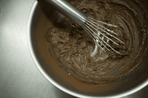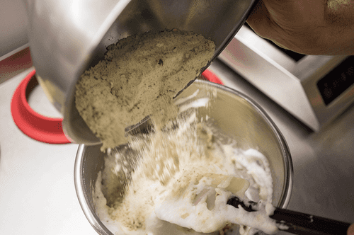 Во взбитые белки аккуратно переложить половину смеси сухих ингредиентов и перемешать все силиконовой лопаткой по направлению снизу вверх. Затем добавить вторую половину и снова перемешать, пока масса не станет полностью однородной. Перемешивать надо быстро и максимально эффективно, снизу вверх.