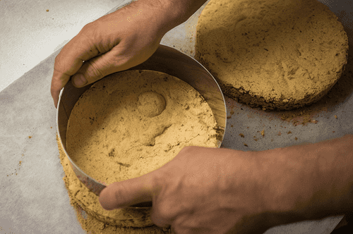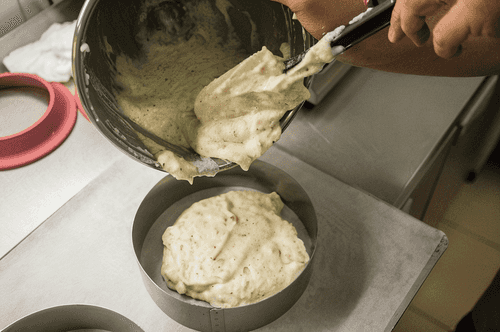 Разделить массу на две части, разровнять ее лопаткой в формах (диаметр 20 см) — не придавливая, а распределяя круговыми движениями. Но не придавайте значения, ровная у нее поверхность или нет.