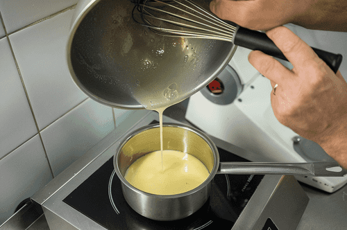 Пока коржи отпекаются и охлаждаются, сварить сироп «Шарлотт». Перемешать венчиком 208 грамм сахара, 37 грамм яиц (это примерно 1 яйцо), 139 грамм молока. Слегка взбить, перелить в сотейник, довести до кипения и оставить увариваться на медленном огне, постоянно помешивая венчиком. Сироп готов, когда его температура составит 104–105 градусов. Уваривать примерно 15 минут до крупных пузырей.