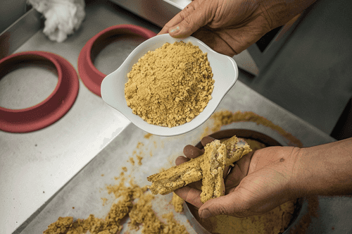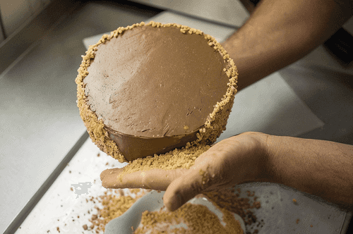 Взять в одну ладонь крошки коржа, в другую — торт, аккуратно придавливать торт к ладони — крошки будут приставать к поверхности. Следить, чтобы крошки чуть заезжали на верх торта, скрывая место, где поверхность соединяется с боками. С обмазкой и обсыпкой диаметр торта возвращается к изначальным 20 см.