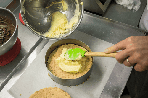 Приступить к сборке торта. На первый корж (он в кольце) выложить почти весь масляный крем и равномерно распределить его лопаткой по поверхности. Около 10% крема оставить.