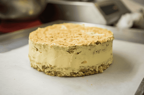 Снять кольцо. Слой крема получится очень толстым, так и надо. Поставить торт в холодильник часов на шесть.