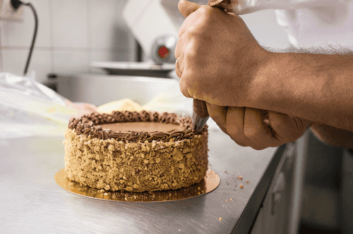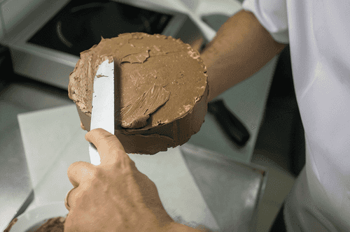 Достать из холодильника торт после охлаждения. Взять шоколадный крем, покрыть толстым слоем края торта и его верх. Примерно 20% крема оставить для украшения.