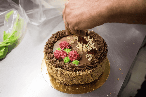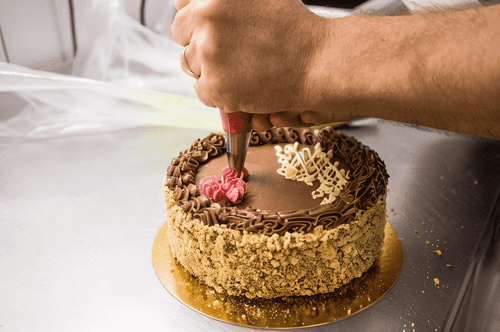 Украсить торт по окружности шоколадным кремом «Шарлотт», который остался от обмазки.
