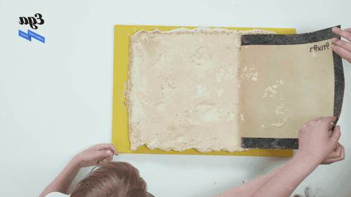 Перевернуть корж на доску, аккуратно снять с него лист.