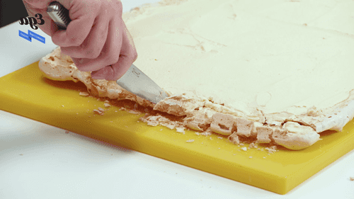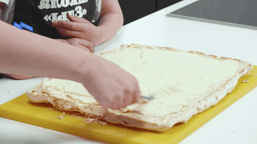 Короткие края меренги надрезать ножом, чтобы он проще сворачивался.