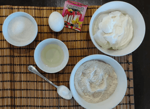 Отмерить нужное количество йогурта, муки, масла, разрыхлителя и сахара (50 г).