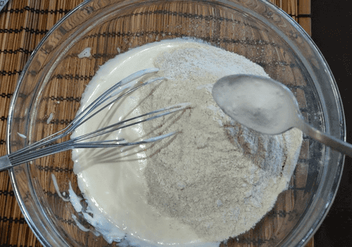 В перемешанную смесь добавить муку и разрыхлитель.