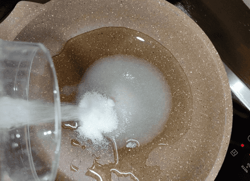 На сковороде соединить сахар с водой.