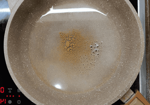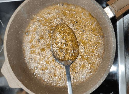 Карамель довести до кипения, готовая она будет янтарного цвета. Можно не перемешивать, но следить, чтобы не пригорела.