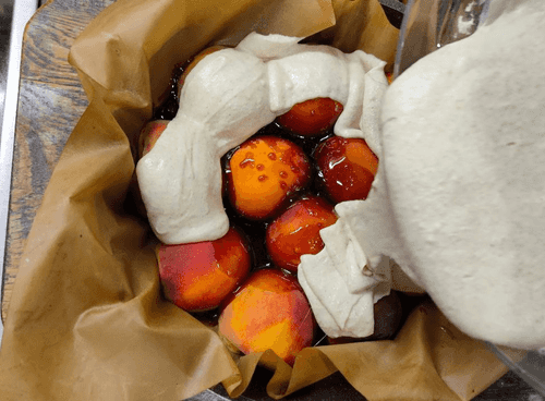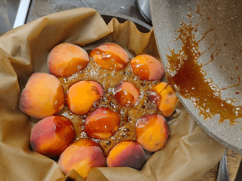 Вылить равномерно горячую карамель на персики.