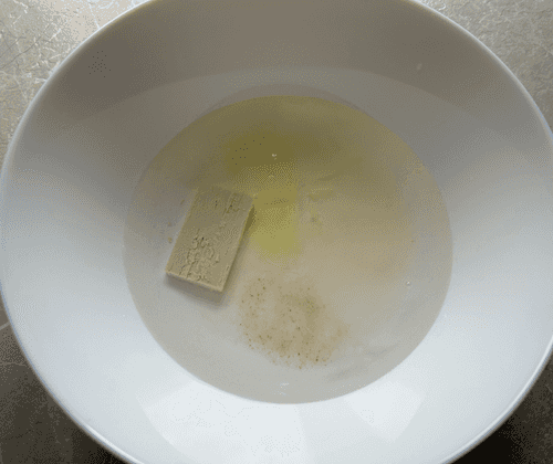 В миску отправить воду, белок, дрожжи, сахар и соль.