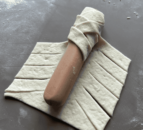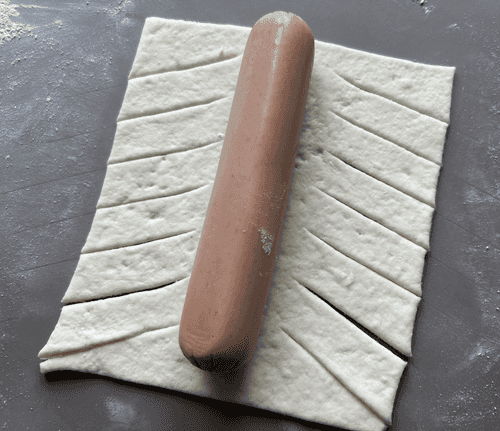 Выложить сосиску и сделать надрезы.