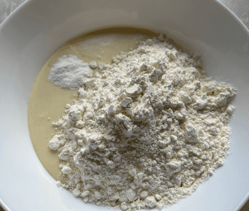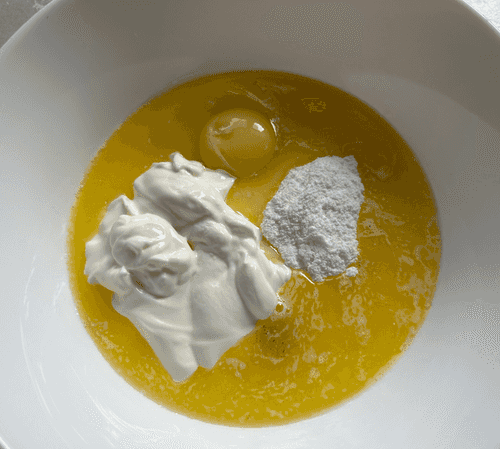 В миску добавить масло, сметану, яйцо, сахарную пудру, ванильный сахар, щепотку соли.