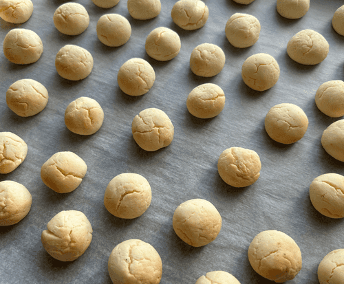 Скатать небольшие шарики и выложить на противень, застеленный пергаментом.
