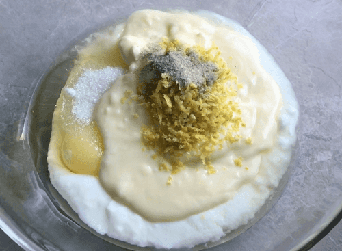 В миску отправить йогурт, мягкое сливочное масло, 1 яйцо и 1 белок, сахар, ванильный сахар, щепотку соли и цедру лимона.