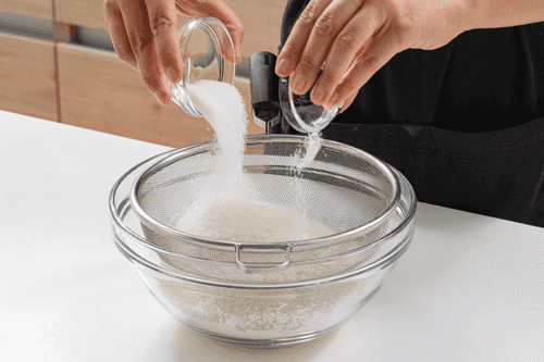 Просеять муку и смешать ее с разрыхлителем, солью и 60 граммами сахара.