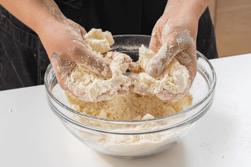 Смешать масло с мучной смесью до состояния крошки. Лучше, чтобы при замешивании руки были холодные.