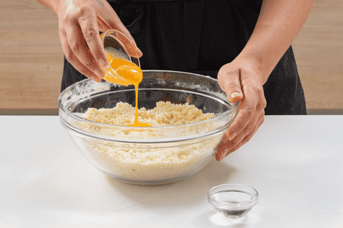 Добавить в тесто желтки и холодную воду. Замесить тесто.