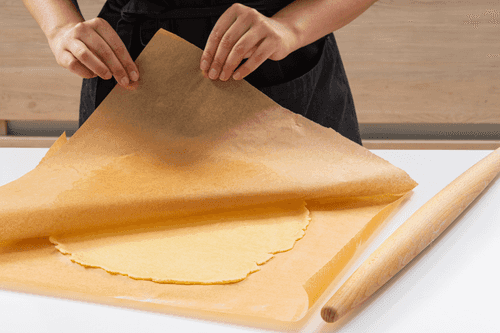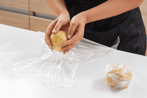 Разделить тесто на две части. Завернуть каждую в пищевую пленку и оставить в холодильнике на 20–30 минут.