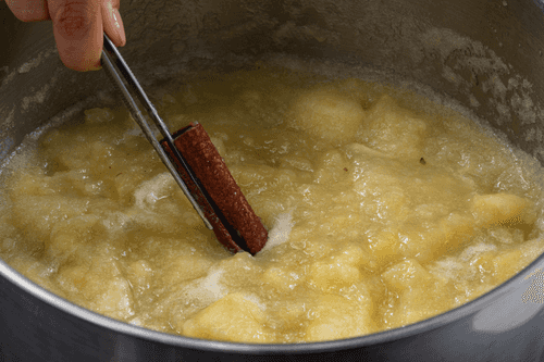 Переложить яблоки в кастрюлю, залить водой и варить до готовности с палочкой корицы примерно 30–40 минут на небольшом огне.