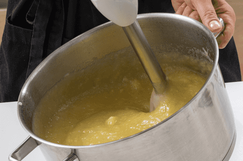 Не сливая воду, пробить содержимое кастрюли блендером.