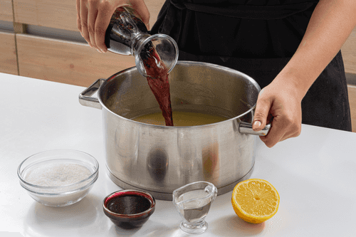 Добавить в кастрюлю сахар, вино, лимонный сок и сок смородины.