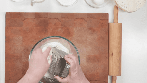 В большую миску высыпать муку. 200 грамм очень холодного масла натереть на крупной терке, периодически обмакивая его в муку для удобства.