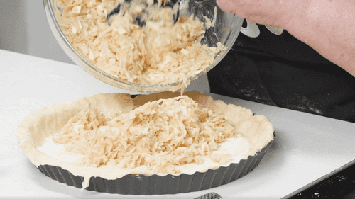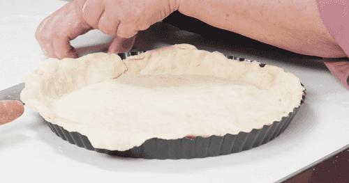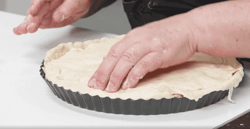 Выложить тесто на дно и стенки формы диаметром 26 см и присыпать его крахмалом (это нужно для того, чтобы влага от начинки не сделала тесто влажным).