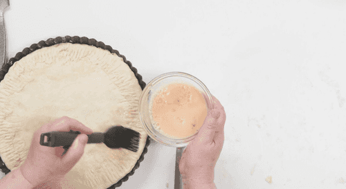 Смазать пирог смесью яйца и молока, если хочется, чтобы он получился румяным и глянцевым. В центре пирога сделать отверстие для выхода пара.