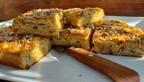 Чуть остывший пирог нарезать на равные порции и подавать к столу.