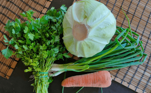 Подготовить овощи: небольшой кочан капусты, морковь, зеленый лук и петрушку.