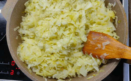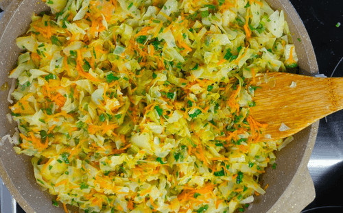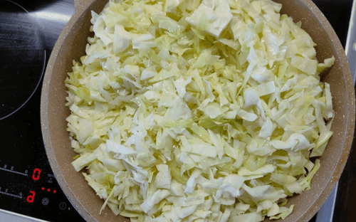 Нашинковать некрупно капусту и сложить в сковороду.
