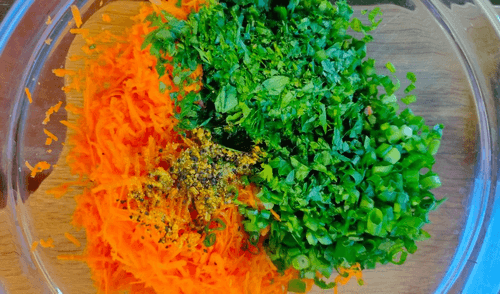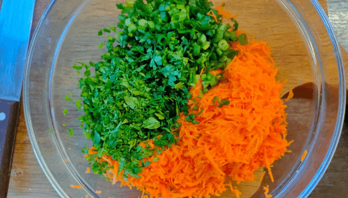 Зелень и морковь собрать в миску.