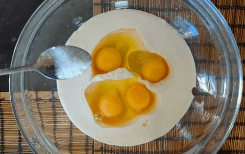 В миску вылить ряженку, разбить яйца, посолить, добавить сахар.