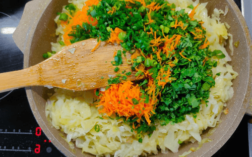 Теперь вернуться к овощам: к готовой капусте добавить все свежие ингредиенты из миски.