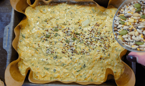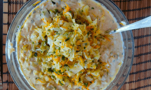 Аккуратно переложить овощи в тесто и перемешать.
