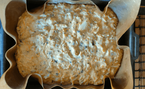 Готовую смесь переложить в противень (можно на пекарскую бумагу или коврик, чтобы пирог не прилип).
