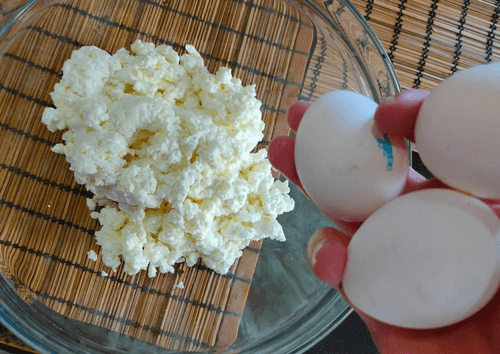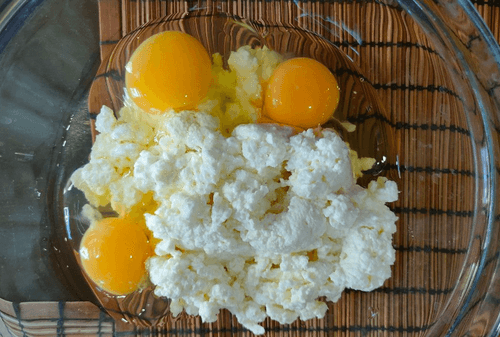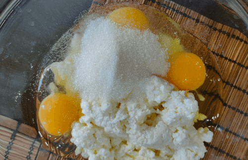 Все тщательно перемешать. Если творог крупинками, следует растереть их с остальными ингредиентами.