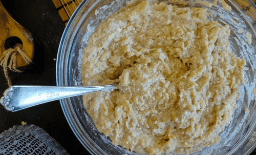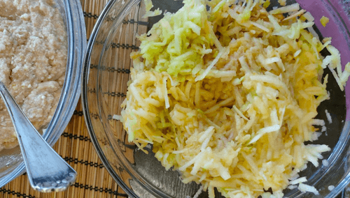 Соединить натертые яблоки с творожно-мучной смесью и тщательно перемешать.