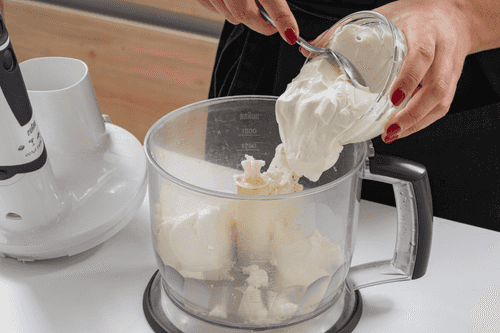Сметану взбить в блендере вместе с творогом с однородную, гладкую массу.