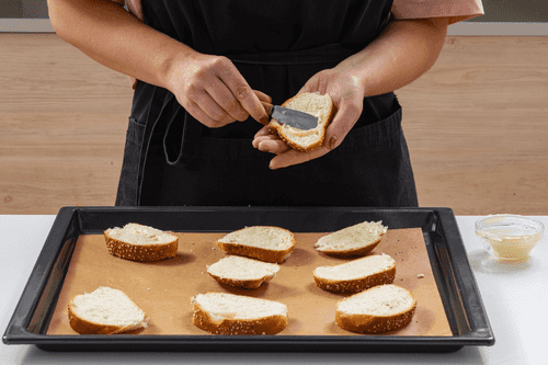 Смазать их половиной сливочного масла и отправить под гриль или в духовку, разогретую до 180 градусов, чтобы подсушить до хрустящей корочки.