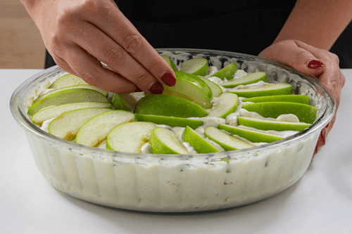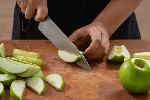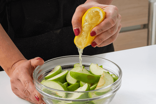 У яблок удалить сердцевину и нарезать на тонкие дольки.
